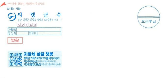 [경남도민뉴스=이상민 기자] 의령군은 지방세 고지서 전면에 ‘지방세 챗봇 상담서비스’ QR코드를 삽입해 발송한다고 밝혔다.