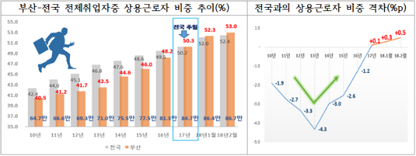 하지만 2014년을 전환점으로 전국과의 격차가 급격히 감소해 지난해 부산의 상용비중이 전국보다 0.1%p 높은 50.3%를 기록했다.