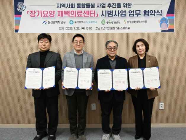 [경남도민뉴스=최재경 기자] 울산 남구는 지역 내 거동불편 어르신들의 건강한 재가생활 지원을 위해 22일 남구청에서 굿모닝한의원, 아주재활의학과의원, 보건소 등과 ‘장기요양 재택의료센터’ 시범사업 업무협약식을 개최했다.