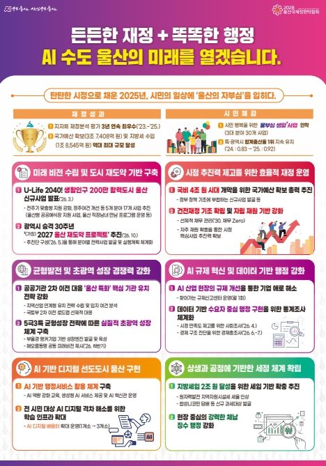 [경남도민뉴스=최재경 기자] 울산시는 2026년 한 해 동안 건전한 재정 운영을 바탕으로 미래 이상(비전) 실현과 도시 재도약을 위한 주요 시정 과제를 본격 추진한다고 밝혔다.