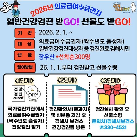 [경남도민뉴스=최미정 기자] 김해시보건소는 2026년 새해를 맞아 의료 취약계층의 질병을 조기에 발견하고 예방하기 위해 의료급여수급권자를 대상으로 『일반건강검진 받GO! 선물도 받GO!』 이벤트를 실시한다고 밝혔다.