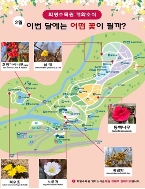 첫 시작인 2월에는 차가운 겨울, 이른 봄의 시작을 알리는 대표 종인 ▲납매 ▲풍년화 ▲복수초 등의 개화 소식을 담은 개화지도가 제공될 예정이다.
