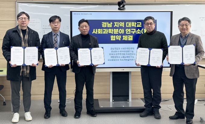 이날 협약식에는 ▲경상국립대 송원근 사회과학연구원장(경제학부) ▲국립창원대 왕태규 사회과학연구소장(행정학과) ▲국립창원대 오상호 지속가능발전연구소장(법학과) ▲인제대 홍재우 민주주의와 자치연구소장(공공인재학부) ▲경남대 정은상 K-민주주의연구소장(노어노문학 전공, 현 창의융합대학장)이 참석하여 협약서에 서명했다.