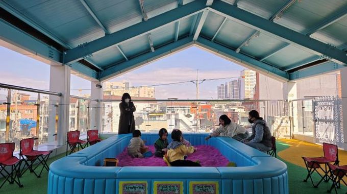 특히 야외 테라스에 설치된 핑크 모래 놀이터는 아이들에게 인기 만점이다.