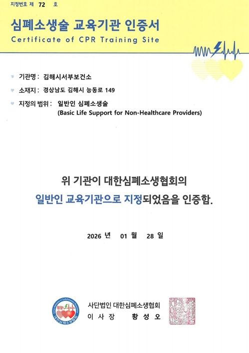[경남도민뉴스=최미정 기자] 김해시는 김해시서부보건소가 대한심폐소생협회(KACPR)로부터 ‘일반인 심폐소생술 교육기관(TS)’으로 공식 지정됐다고 6일 밝혔다.