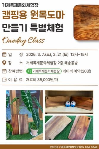 [경남도민뉴스=김부경 기자] 거제목재문화체험장은 오는 3월 7일과 3월 21일, 성인 방문객을 대상으로 한 원데이클래스 프로그램 『캠핑용 원목도마 만들기 특별체험』을 운영한다고 밝혔다.