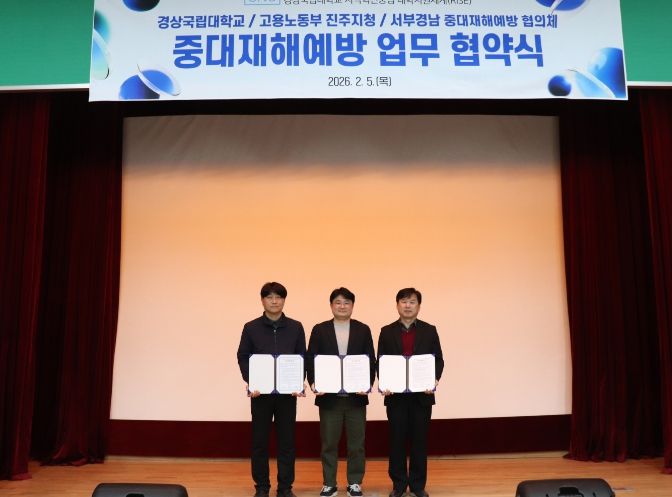 [경남도민뉴스=구인애 기자] 경상국립대학교 라이즈(RISE) 사업단은 2월 5일 사천시 근로자종합복지관에서 서부경남 중대재해 예방 협의체 및 고용노동부 진주지청과 업무협약을 체결했다.