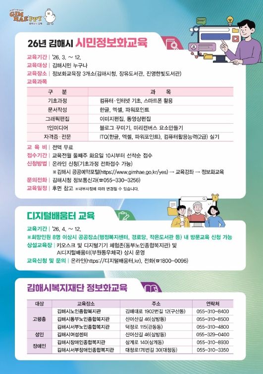 시민정보화교육은 3월 3일부터 운영되며, 수강 신청은 교육 시작 전월 둘째 주 화요일 오전 10시부터 김해시 공공예약포털 내 정보화교육 페이지를 통해 진행된다.