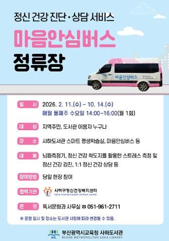 [경남도민뉴스=김채연 기자] 부산광역시립사하도서관은 오는 2월부터 10월까지 매월 둘째 주 수요일마다 도서관 스마트 평생학습실과 마을안심버스에서 지역주민을 대상으로 ‘마을안심버스 정류장’을 운영한다.