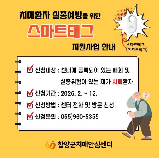 [경남도민뉴스=장광동 기자] 함양군치매안심센터는 치매 환자의 실종을 예방하고 위급 상황 발생 시 신속한 발견을 돕기 위해 위치 확인을 할 수 있는 ‘스마트 태그’를 무상으로 지원한다고 밝혔다.