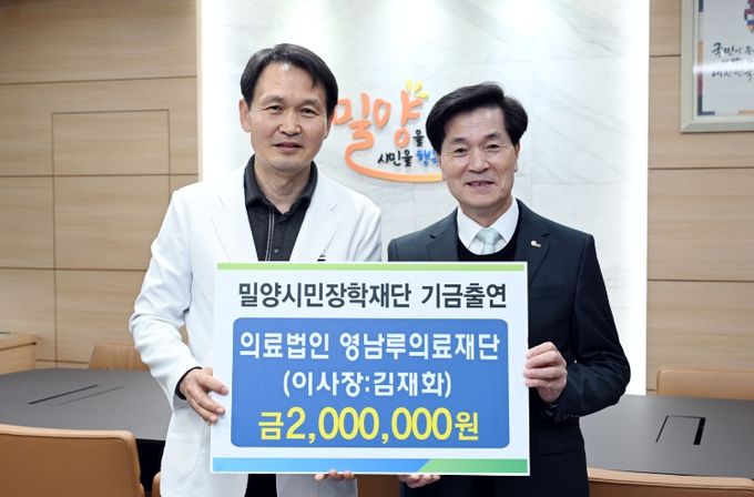 [경남도민뉴스=나희준 기자] (재)밀양시민장학재단(이사장 안병구)은 10일 의료법인 영남루의료재단(이사장 김재화)과 대한숙박업중앙회 밀양시지부(지부장 조희선)에서 지역 교육 발전을 위한 장학기금으로 각각 200만원과 300만원을 기탁했다고 밝혔다.