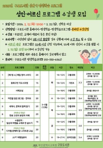 [경남도민뉴스=김채연 기자] 부산광역시립구포도서관은 오는 3월부터 5월까지 관내 지역 주민들을 대상으로 2026년 상반기 ‘평생학습 프로그램’을 운영한다고 밝혔다.