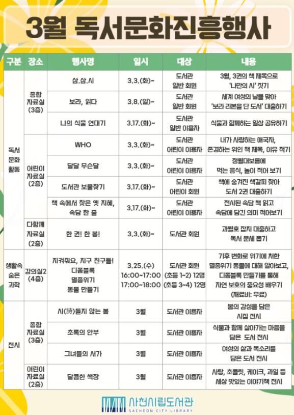 [경남도민뉴스=변정형 기자] 사천시립도서관은 2026년 3월을 맞아 시민들의 일상에 따스한 봄기운과 문학적 온기를 전하기 위한 ‘3월 독서문화진흥행사’를 운영한다고 11일 밝혔다.