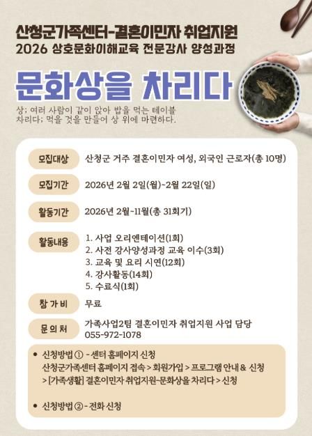 [경남도민뉴스=김태수 기자] 산청군가족센터는 오는 22일까지 결혼이민자의 안정적인 사회 참여와 취업 역량 강화를 위해 '상호문화이해교육 강사양성과정'참여자를 모집한다고 10일 밝혔다.