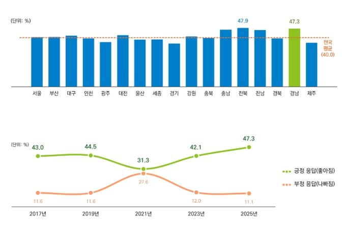 2025년 사회조사 결과, 경상남도는 전반적인 생활여건에서 ‘좋아졌다’는 긍정 응답이 47.3%로 전국 2위를 기록했으며, 사회보장제도(52.8%)와 문화·여가생활 여건(48.1%)에서는 전국 1위, 보건의료서비스(46.6%)에서도 전국 4위에 오르는 등 주요 생활여건 지표 전반에서 전국 최상위권의 성과를 보였다.
