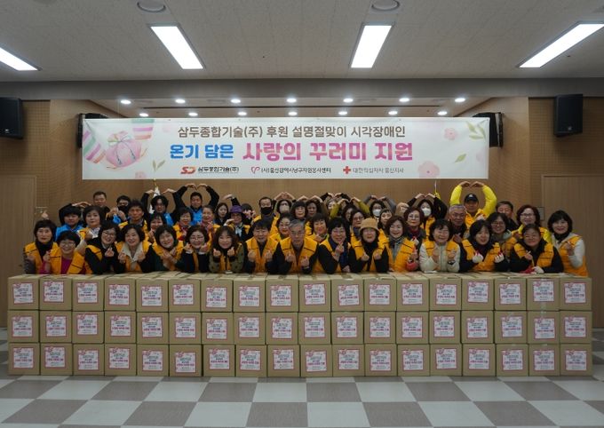 이날 행사에는 자원봉사자와 삼두종합기술 임직원 70여명이 참가해 떡국떡, 즉석국, 참기름, 견과류, 참치세트, 라면, 바디워시 등 총 13종의 생필품을 직접 포장한 후 울산시시각장애인 복지관을 이용하는 시각장애인 100세대에 전달하며 이웃사랑을 실천했다.