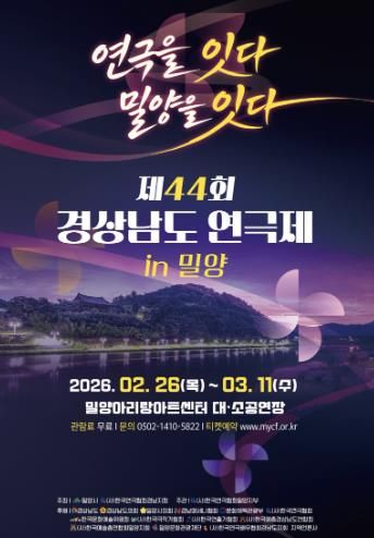 [경남도민뉴스=나희준 기자] 밀양시는 경남 연극인들의 최대 축제이자 경연대회인 ‘제44회 경상남도 연극제’가 오는 2월 26일부터 3월 11일까지 14일간 밀양아리랑아트센터에서 개최된다고 밝혔다.