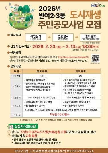 두 사업 모두 사업비의 10%는 자부담해야 한다. 신청하려는 주민은 반여2·3동 도시재생현장지원센터 블로그에서 신청서를 내려받아 3월 13일까지 이메일이나 센터(해운대구 재반로 267)를 방문해 접수하면 된다.