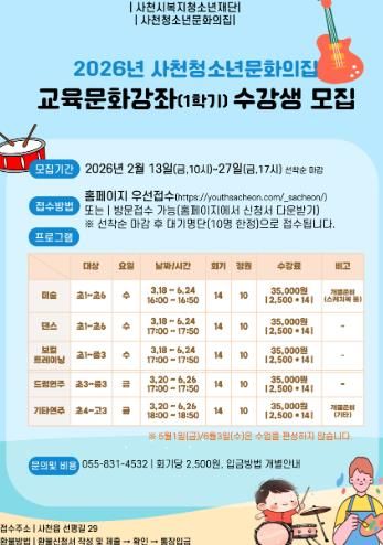 [경남도민뉴스=변정형 기자] 사천시 복지·청소년재단 청소년문화의집은 청소년들의 재능 발굴과 건강한 자아 성장을 지원하기 위해 ‘2026년 1학기 교육문화강좌’ 수강생을 모집한다.