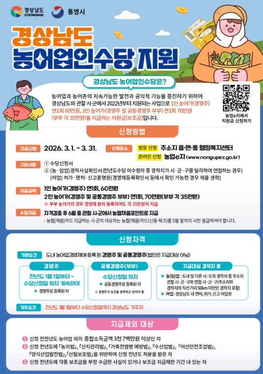 [경남도민뉴스=김부경 기자] 통영시는 농어업의 공익적 기능 강화와 농어촌의 지속 가능한 발전을 위해 지급하는‘2026년 농어업인수당’을 다가오는 3월 1일부터 31일까지 한 달간 신청 받는다고 밝혔다.