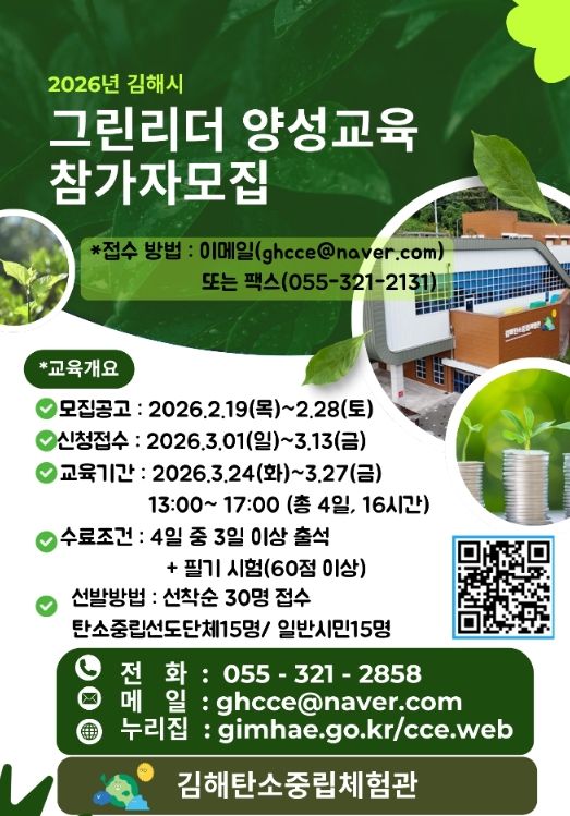 그린리더 양성교육은 김해시민을 대상으로 탄소중립 선도단체 15명과 일반시민 15명 등 총 30명을 선착순 모집해 3월 24일부터 27일까지 총 4일간 김해탄소중립체험관 교육장에서 교육을 진행한다.