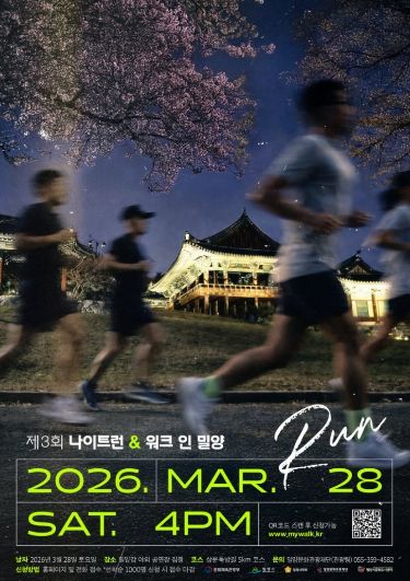 [경남도민뉴스=나희준 기자] 밀양문화관광재단은 오는 3월 28일 삼문동 밀양강 둔치 일원에서 벚꽃 철을 맞아 지역 야간관광 활성화를 위한 이색 러닝 축제 ‘제3회 나이트 런 앤 워크 인 밀양(Night Run & Walk in Miryang)’을 열고, 3월 22일까지 참가자를 모집한다.