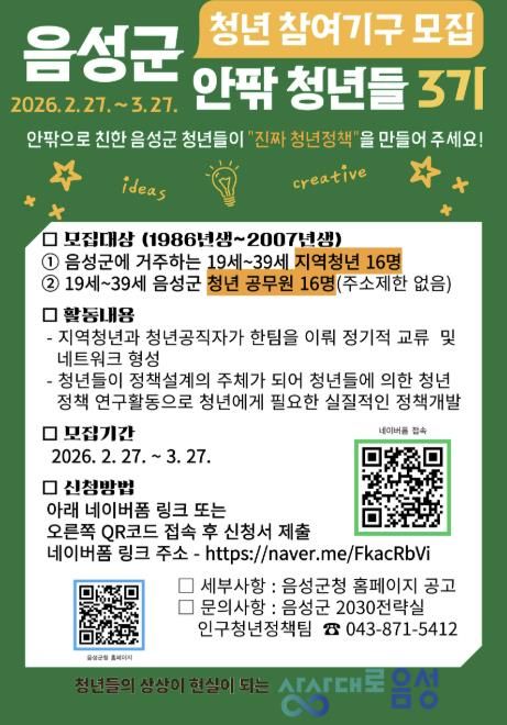 [경남도민뉴스=박만수 기자] 음성군은 청년공무원과 지역청년이 협력하여 청년에 의한 ‘진짜’ 청년정책을 만드는 청년 참여기구 ‘안팎 청년들 3기’ 참여자를 모집한다고 밝혔다.