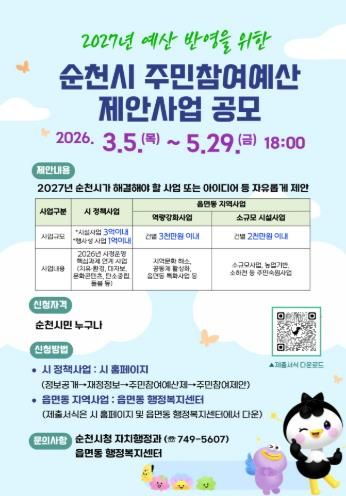 [경남도민뉴스=최인태 기자] 순천시는 2027년도 예산편성 과정에 시민의 다양한 의견과 아이디어를 반영하기 위해 3월부터 5월까지 주민참여예산 제안사업을 접수한다고 밝혔다.