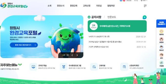 창원시 환경교육포털은 환경교육 프로그램 안내, 신청, 교육자료 제공 등 환경교육 관련 정보를 한 곳에서 통합 제공하는 환경교육 통합 플랫폼으로 시민 누구나 쉽고 편리하게 환경교육 정보를 이용할 수 있도록 구축됐다.