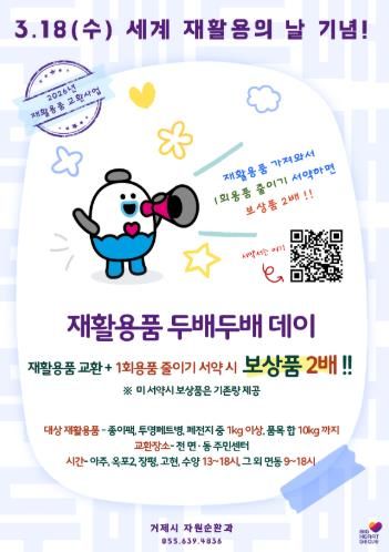 [경남도민뉴스=김부경 기자] 거제시는 3월 18일 ‘세계 재활용의 날’을 맞아 자원재활용의 중요성을 알리고, 1회용품 줄이기 실천을 확산하기 위해 ‘재활용품 교환사업’ 보상품을 2배로 지급하는 '재활용품 두배두배 데이'를 개최한다.