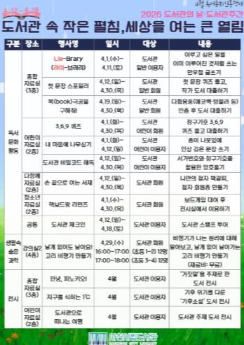 행사 일정은 사천시립도서관 누리집에서 확인할 수 있으며, 기타 문의는 자료실로 하면 된다.