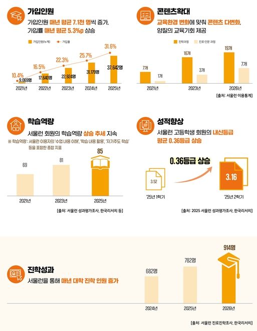 서울시 조사 결과, 올해 대학에 합격한 서울런 학생 914명 중 주요 대학‧학과 합격자는 전년 대비 21%(2025년 63명→ 2026년 76명) 늘어난 것으로 나타났다.