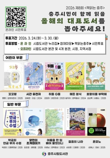 [경남도민뉴스=박만수 기자] 충주시립도서관은 오는 30일까지 2026년 제8회 ‘책읽는 충주’ 독서운동의 대표 도서 선정을 위한 시민 투표를 실시한다고 24일 밝혔다.