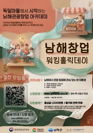 [경남도민뉴스=김부경 기자] 남해관광문화재단은 관광 기반 창업 몰입 프로그램 ‘남해 창업 워킹홀릭데이’에 함께할 참가자를 오는 4월 2일까지 모집한다고 밝혔다.