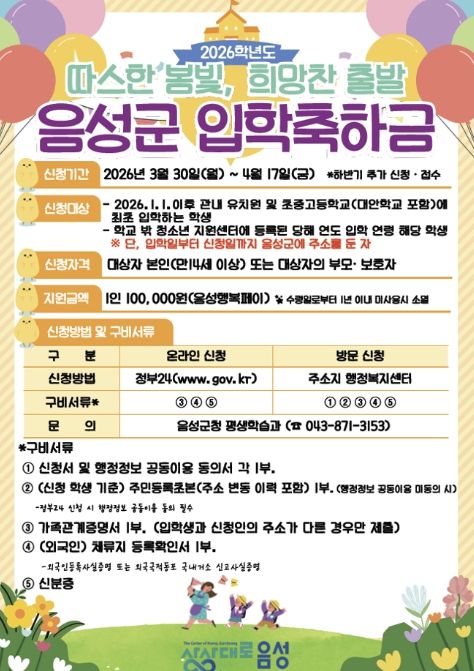 [경남도민뉴스=박만수 기자] 음성군은 올해 2026학년도 입학을 맞아 관내 유치원과 초·중·고등학교 입학생, 그리고 학교 밖 청소년지원센터에 등록된 입학 연령에 해당되는 청소년을 대상으로 입학축하금을 지원한다고 밝혔다.