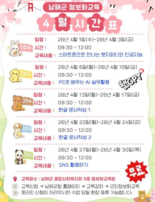 이번 교육은 남해군 종합사회복지관 3층 정보화교육장에서 실시되며, △스마트폰으로 만나는 챗지피티와 인공지능, △PC로 배우는 AI 실무 활용 과정으로 구성돼 있다.