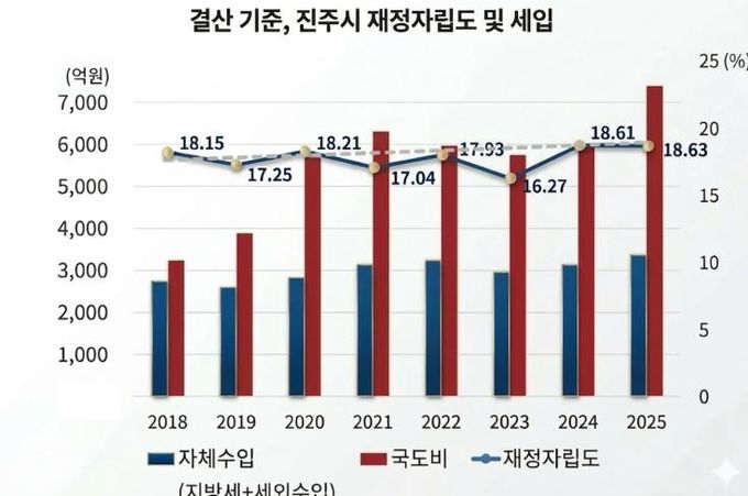 한편, 진주시의 결산 기준 재정자립도는 2018년 18.15%에서 2025년 18.63%를 기록하며 큰 변동 없이 유지되고 있다.