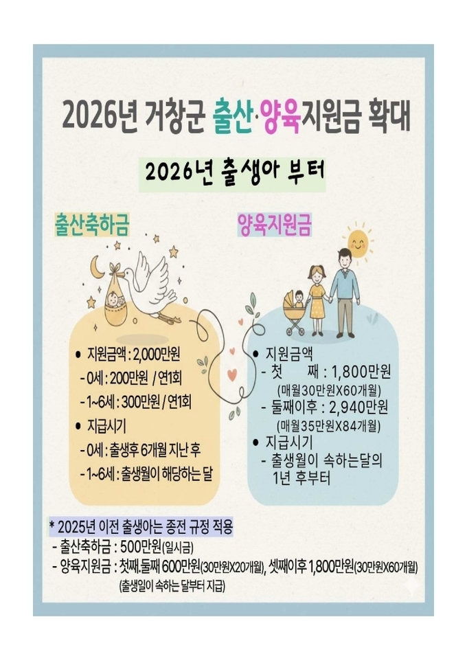 주요 개정내용으로는 출산축하금 지원금액을 출생아 1명당 500만원에서 2,000만원으로 확대하고, 기존 일시금 지급방식에서 7년 분할(연 1회) 지급으로 변경해 거창군 내 장기 정착을 유도할 계획이다.