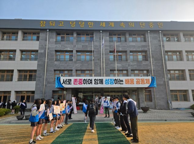 [경남도민뉴스=박만수 기자] 충청북도단양교육지원청은 3월 26일(목) 단양중학교에서 생명존중 의식을 높이고 안전한 학교를 만들기 위한 학교폭력 예방 캠페인을 진행했다.