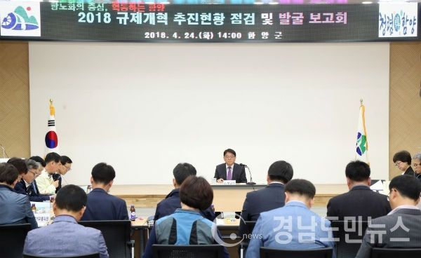 (함양/최병일) = 함양군은 24일 오후 2시 군청 대회의실에서 강현출 부군수 주재 규제개혁 추진현황 점검 및 발굴 보고회를 열고, 민생규제 혁신과제와 네거티브 규제 및 일자리 중심 규제 등 3개 분야 50여건을 발굴했다고 설명했다.