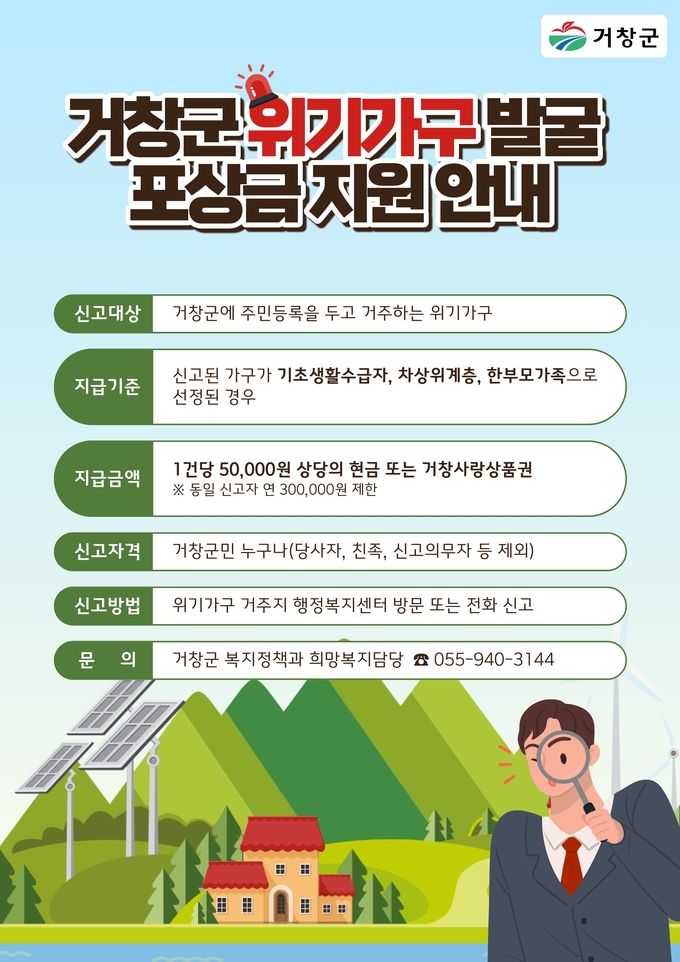신고 대상은 실직, 질병, 학대 등으로 어려움을 겪고 있는 위기가구로 거창군에 주민등록을 두고 있는 가구여야 한다.