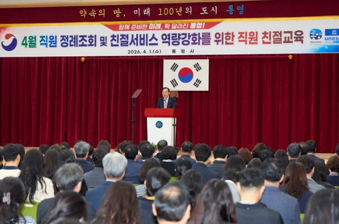 [경남도민뉴스=김부경 기자] 통영시는 지난 1일 시청 강당에서 4월 직원 정례조회를 열고, 주요 현안의 차질 없는 추진과 시민 안전, 민생 안정을 위한 행정 대응 방향을 공유했다.