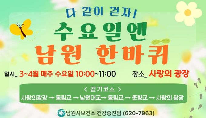 [경남도민뉴스=최인태 기자] 남원시보건소가 시민의 건강 증진과 일상 속 운동 습관 형성을 위해 오는 4월부터 11월까지 걷기 실천 프로그램인 ‘수요일엔 남원 한바퀴’를 운영한다.