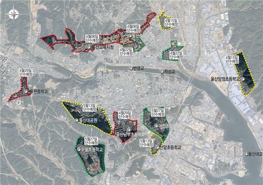 이 기간 동안 ▲중구 유곡동, 우정동, 교동, 복산동, 성안동, 태화동, 남외동, 서동, 북정동, 반구동, 약사동 일부 지역 ▲남구 옥동, 신정2동, 신정4동, 선암동, 야음동, 무거동, 두왕동 일부 지역 ▲북구 양정동 일부 지역에서 순차적으로 단수가 진행된다.