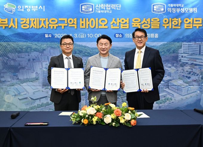 [경남도민뉴스=김동규 기자] 의정부시는 4월 3일 시청 회룡홀에서 가톨릭대학교 의정부성모병원, 가톨릭대학교 산학협력단과 함께 ‘의정부시 경제자유구역 바이오 산업 육성을 위한 업무협약’을 체결했다.