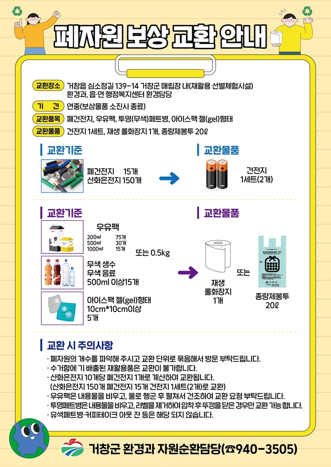 사업은 연중 상시 진행되며, 환경과와 12개 읍·면 행정복지센터 및 재활용선별 체험시설에서 폐자원을 교환할 수 있다. 거창군민 누구나 참여할 수 있으며, 사업 참여 방법과 자세한 교환 기준은 거창군 누리집이나 홍보자료를 통해 확인할 수 있다.