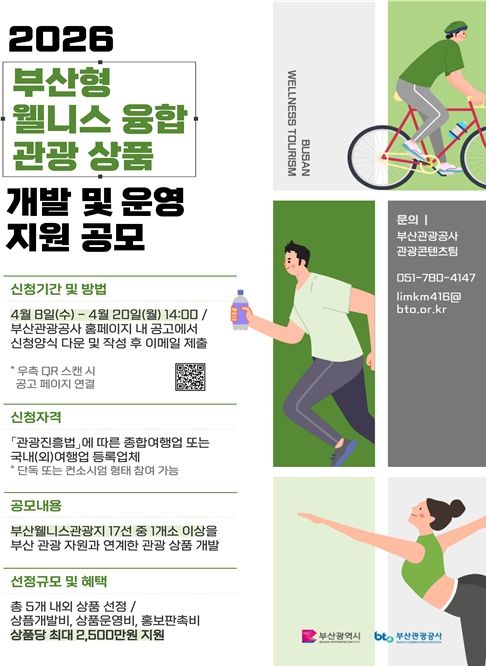 [경남도민뉴스=신석주 기자] 부산시와 부산관광공사는 부산 웰니스 관광자원을 활용한 융합 관광상품 개발과 글로벌 시장 진출을 지원하기 위해 '부산형 웰니스 융합 관광상품 개발 및 운영 지원' 공모를 오는 4월 20일까지 실시한다고 밝혔다.