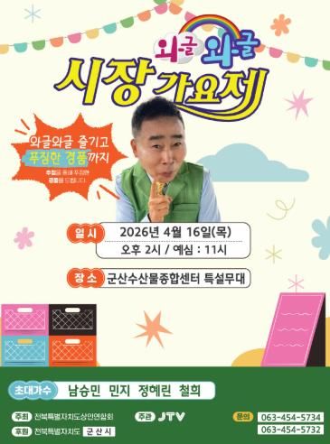 [경남도민뉴스=최인태 기자] 군산시가 전통시장에 활력을 불어넣고 시민과 상인이 함께 어우러지는 문화의 장을 마련하고자 ‘와글와글 시장가요제’를 오는 4월 16일 오후 2시, 군산수산물종합센터 신축 건어동 앞 광장에서 개최한다.