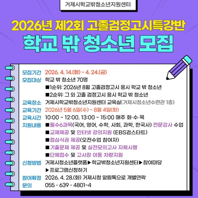 [경남도민뉴스=김부경 기자] 거제시학교밖청소년지원센터에서는 2026년도 제2회 고등학교 졸업학력 검정고시 대비 검정고시특강반에 참석할 학교 밖 청소년을 모집한다.