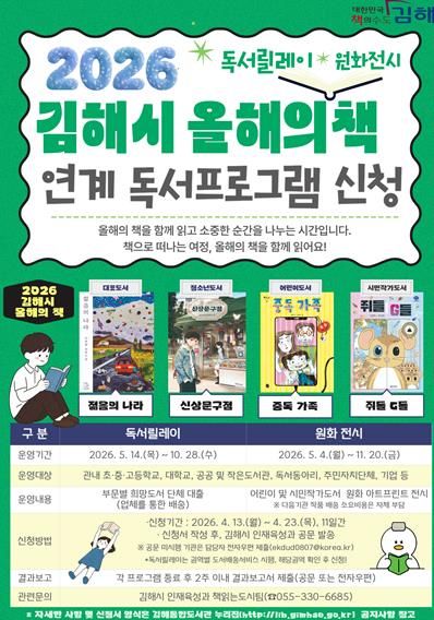 [경남도민뉴스=최미정 기자] 김해시는 ‘2026 김해시 올해의 책’ 독서릴레이와 독후활동에 참여할 기관 및 단체를 13일부터 모집 중이라고 밝혔다.